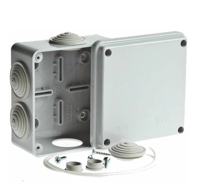оторой сводятся провода электропроводки. Коробка обладает степенью защиты от пыли и влаги IP54, что обеспечивает безопасность, защиту от сырости и механических повреждений.