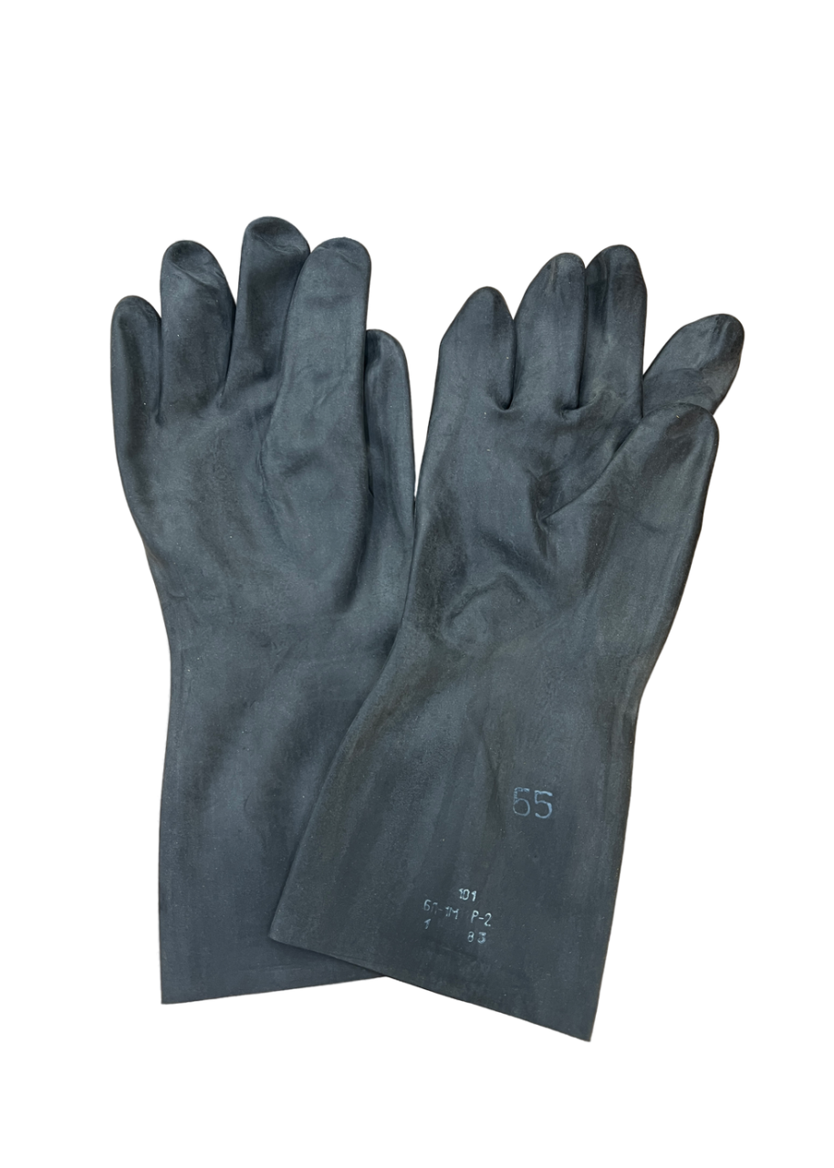 Перчатки двухслойные, внутренний и наружный слой отличаются по цвету. Перчатки выдерживают концентрацию кислот до 80% и щелочей до 50%.