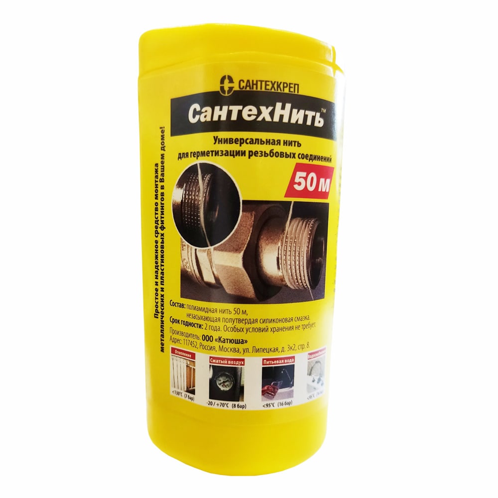Нить для герметизации резьбы «СантехНить» (20 м) поможет уплотнить соединение практически между любыми материалами. Купить ее вы можете, если собираетесь монтировать систему отопления, газоснабжения или водопровод. Намотав нить на резьбу, вы обеспечите герметичную компоновку труб без риска их повредить.