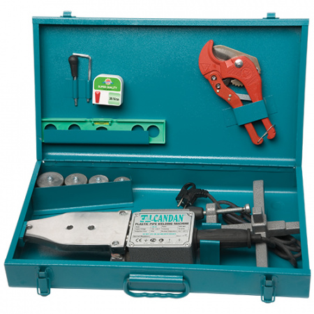 Паяльник для полипропиленовых труб «СANDAN СМ-01» поставляется в комплекте со всем необходимым для проведения сварочных работ. В комплектацию входит удобная подставка для фиксации аппарата во время проведения работ, рулетка, ножницы для резки труб, металлический чемодан.