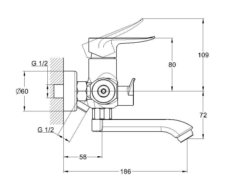 Комплектность: корпус смесителя, дивертор с прокладками, излив, шланг