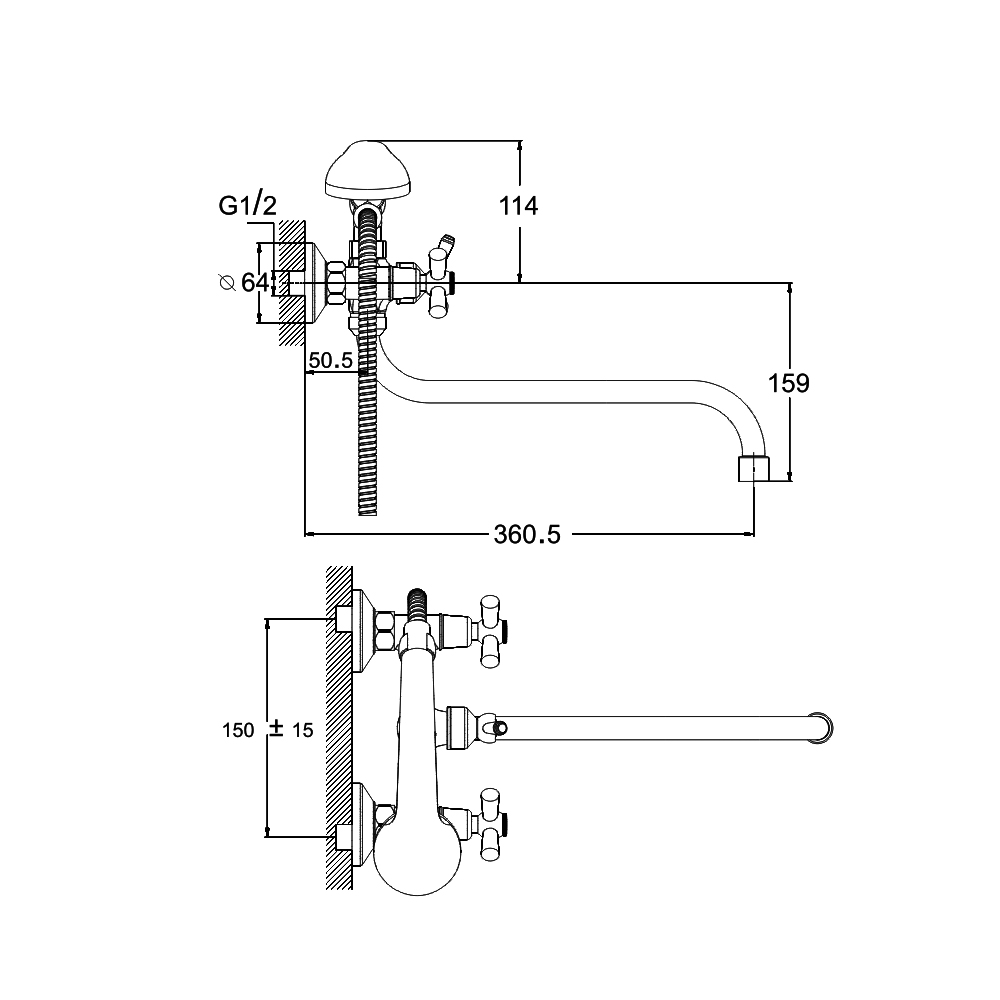 Комплектность: корпус смесителя, излив, шланг д/душа 150см с прокладками,