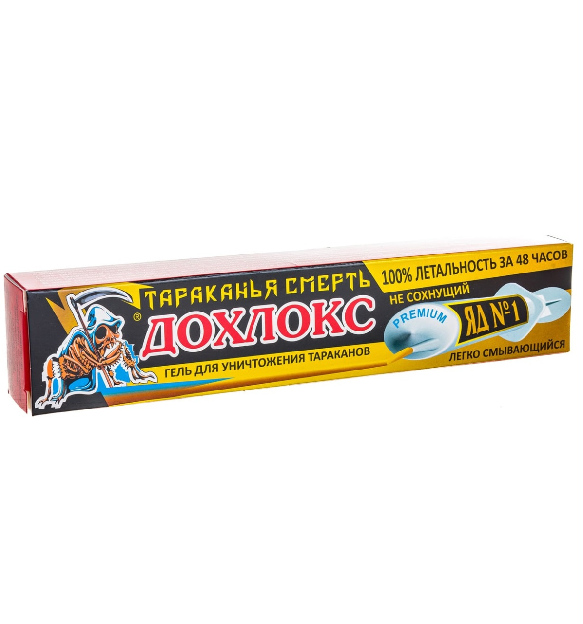 овых скопищ тараканов. Его обычно используют, чтобы уничтожить очень много тараканов. Если борьба с тараканами все время откладывается на завтра, то они разводятся в таких количествах, что уже падают с потолка. И если это произойдет не у вас, а у ваших соседей, будьте уверены, скоро тараканы нахлынут и к вам. В этом случае придется проводить мощную ударную обработку особо сильным средством. Гель «Дохлокс Сгинь (яд 76) усиленный» рекомендуется к применению в особо тяжелых случаях, когда насекомых в квартире очень много и другие средства не помогают.