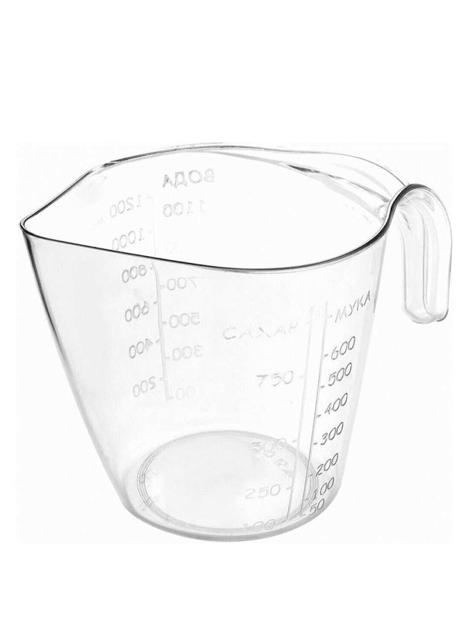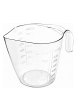 зопасного для контакта с пищевыми продуктами, не имеющего запаха) , специальным носиком, позволяющим не расплескать жидкость при переливании и удобной ручкой. Мерная шкала нанесена в граммах и литрах для разных видов продуктов. Кувшином можно отмерять как сыпучие продукты, так и жидкости.