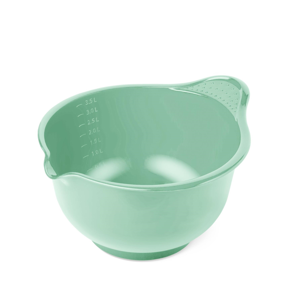 одаря которой взбиваемое содержимое не разбрызгивается. Эргономичная ручка помогает удобно держать миску во время взбивания, а сливной носик удобен для переливания. Внутренняя мерная шкала позволит оценить объем приготовленного теста. Миски легко мыть, в т.ч. в посудомоечной машине.