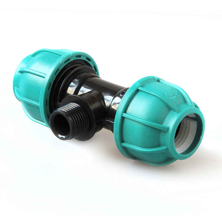й для ПНД труб. Отвод компрессионный с наружней резьбой позволяет соединить трубопровод из ПНД к стальному трубопроводу без применения сварочных работ.
